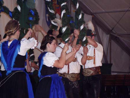 Die Aktiven Buam plattelten mit den Rotanschöringern zusammen das Birkenstoana Glöckei, später führten die Aktiven den Laubentanz auf und standen zur Geschenkübergabe durch die Vorstände Koll und Hochpointner Spalier.