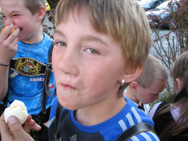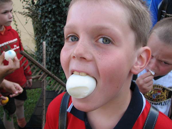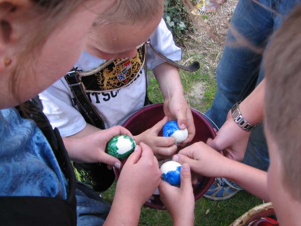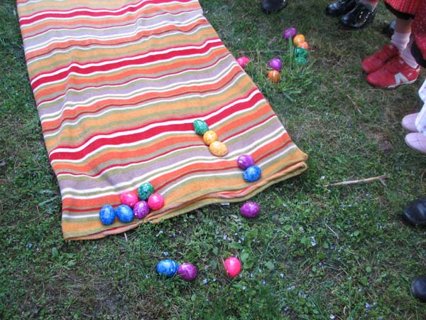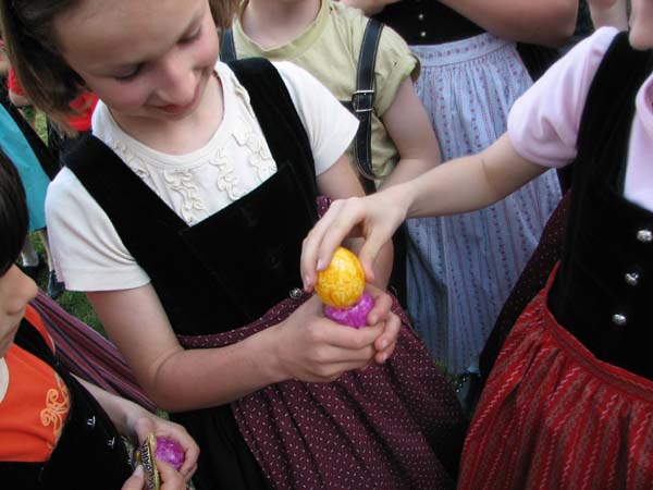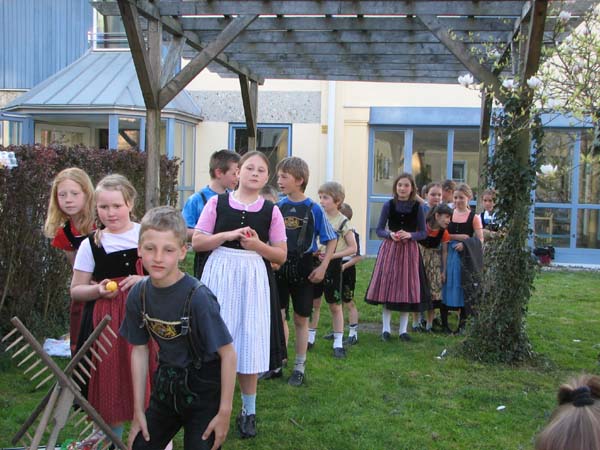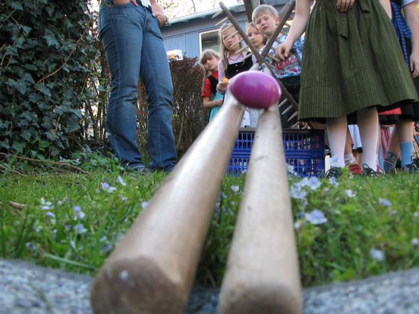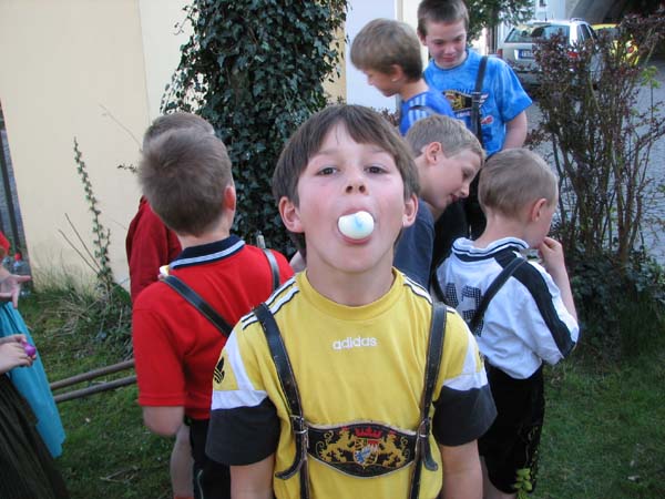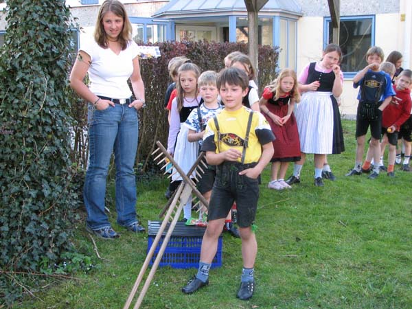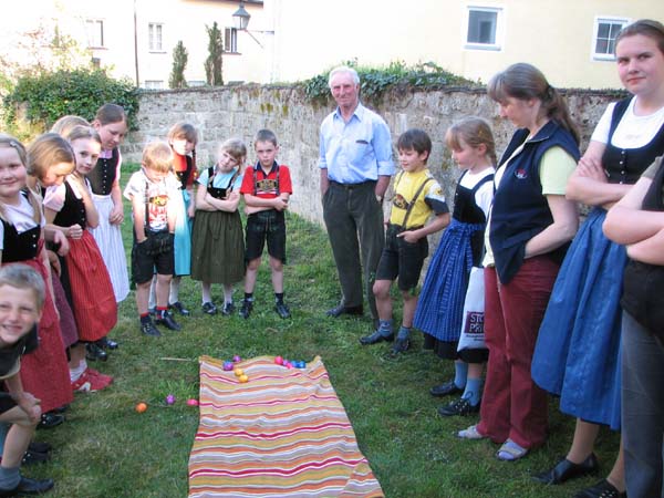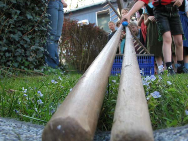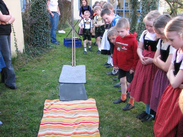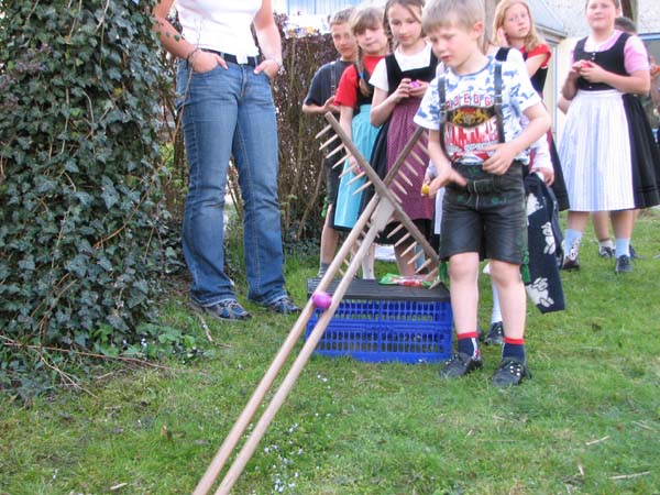 Bei der ersten Probe nach Ostern war´s noch vor der Probe zum Oascheim und Oabegga. Ca. zweidrittel der Kinder konnten sich vom Oascheim nicht´s vorstellen. Bei der Anzahl der Kinder wurde in 4er Gruppen angetreten und die jeweiligen Sieger mußten nochmal ausscheiben. Da der Rasen vorm Pfarrsaal etwas lang war wurde nach den Rechen noch eine Decke ausgebreitet und somit die Länge der Rollbahn verlängert.