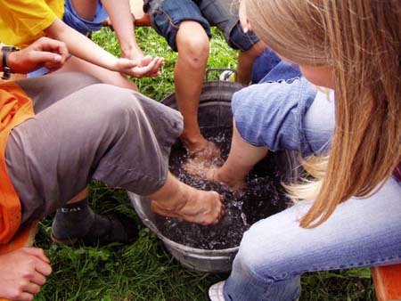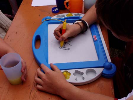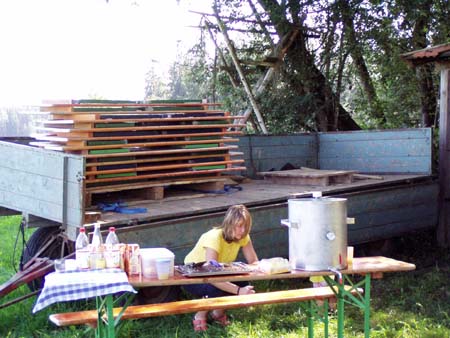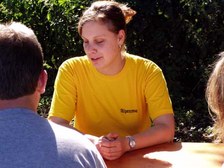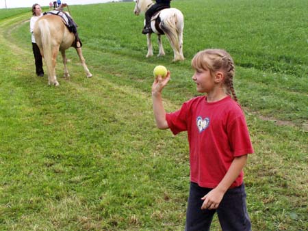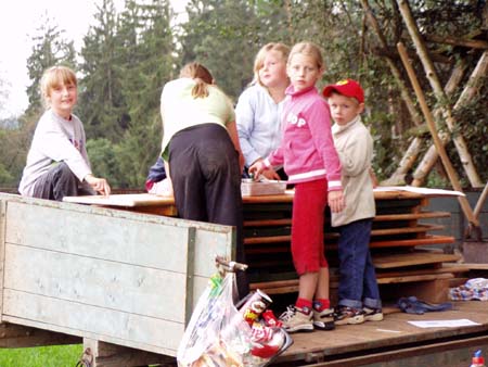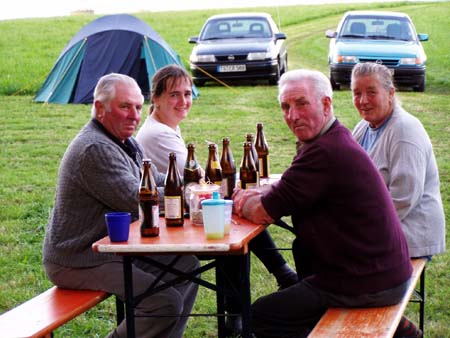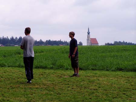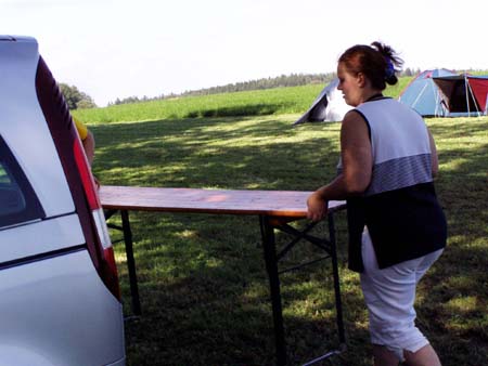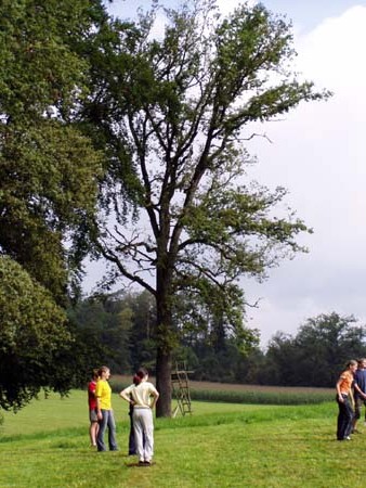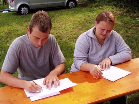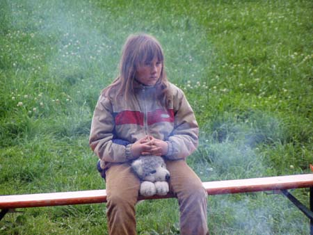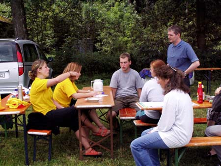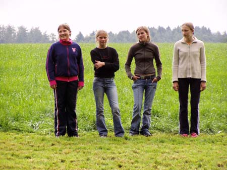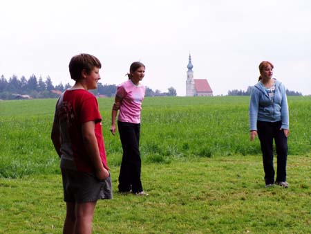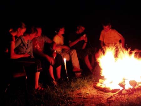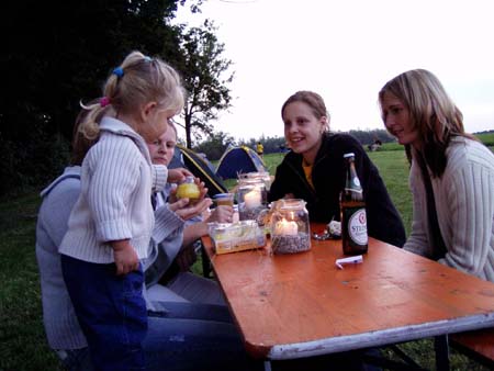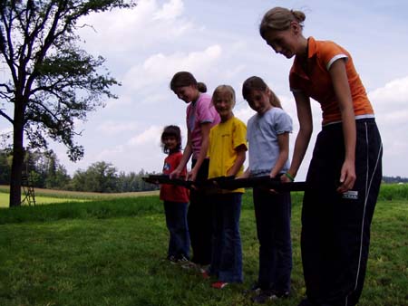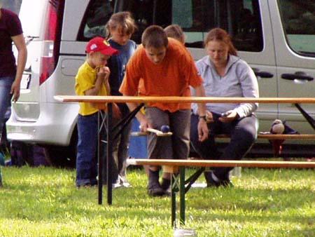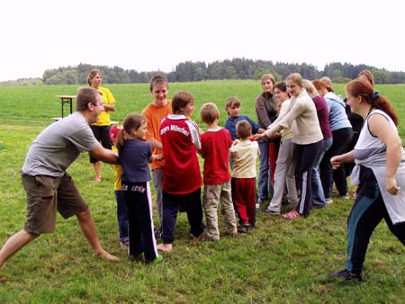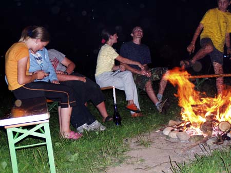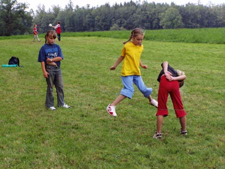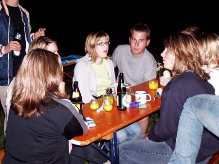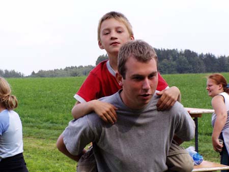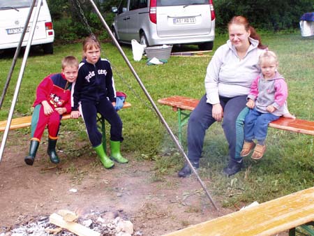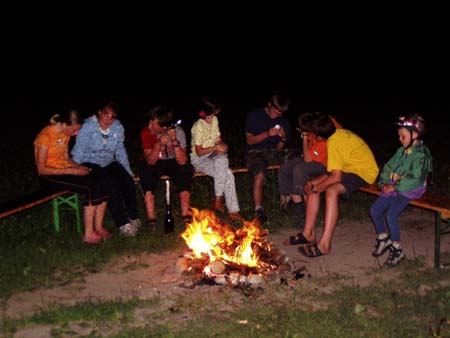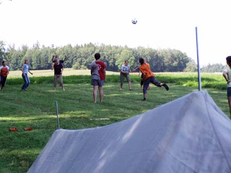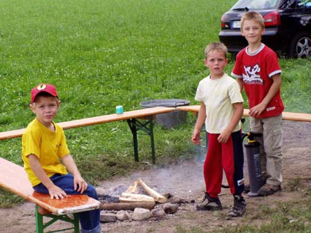 Am 12.08.05 begann für uns ein schönes Ereignis, das alljährliche Zeltlager. Da wir, „die großen Mitglieder“ etwas unter uns sein wollten, wurde beschlossen dass erstmals nur wir kamen und am nächsten Tag die „kleineren“ mit zelteten. Es wurde immer ein großer Spaß, da der „Pauli“ uns immer mehr gemähte Wiese zur Verfügung stellte, natürlich für unsere Lieblingsbeschäftigung Völkerball. Bei diesem Spiel spielten nicht nur wir, sondern auch einige aus der Aktivengruppe mit. Der erste Tag war noch recht freundlich, hier und da eine Wolke und sonst strahlender Sonnenschein, wir waren natürlich zuversichtlich. Am Abend wurde dann gegrillt und das Lagerfeuer entzündet. Die meisten von uns haben sich dann zusammen ans Lagerfeuer gesessen. Es wurde immer dunkler und kälter. Zeit, dass wir uns wärmer anzogen. Nach und nach gingen viele zu Bett. Wir blieben sitzen und ein eher „stillgelegtes“ Mitlied unter uns, genannt Otto, packt kurzerhand seinen Schlafsack und machte es sich unter einer der Bänke bequem. Wir fingen an, plötzlich, die Sternschnuppen zu zählen, da ja viele in dieser Nacht kommen sollten. Es wurde 3.00 Uhr früh Samstags, als die letzten in ihre Zelte gingen doch plötzlich ging das geplapper wieder los, einige Tropfen fingen an sich vom Himmel zu lösen. Es hörte aber bald wieder auf und Ruhe kehrte ein. Als alles von vorne losging, und es sogar zu regnen anfing, löste es panisches geplapper aus. Am nächsten Tag standen, das war gewiss, einige Zelte unter Wasser. Die Ersten wachten schon um 5.00 Uhr auf, da einige unter uns die Güte besaßen ihren CD-Player anzuschalten und uns die Nachrichten wissen ließen. Total verschlafen kamen wir aus unseren Betten uns setzten uns sogleich ans Lagerfeuer. Es gab einige Störungen der Nacht zu besprechen. Unser allzeit beliebter „Couch“ Ferdinand nannte uns „Quasseltanten“, wobei er gar nicht so unrecht hatte. Als alle gefrühstückt hatten, auch gegen ihren Willen und so einigermaßen wach waren, begannen wir wieder Völkerball zu spielen. Es wurde ein tolles Spiel. Nach dem Spiel wurde eine kleine Konferenz vom Klausi eingerufen. Das Wetter würde nicht mehr lange herhalten. Es gab da Möglichkeit 1: wir würden die angesagte Olympiade machen und am Abend grillen. Oder Möglichkeit 2: wir brechen das ganze ab und die „kleineren“ die heute kommen würden bräuchten gar nicht erscheinen. Unter rauchenden Köpfen wurde fieberhaft überlegt, was zutun wäre. Am Schluss entschieden wir uns für Möglichkeit 1. So wurde trotz nicht allzu guten Wetterbedingungen die Olympiade abgehalten.